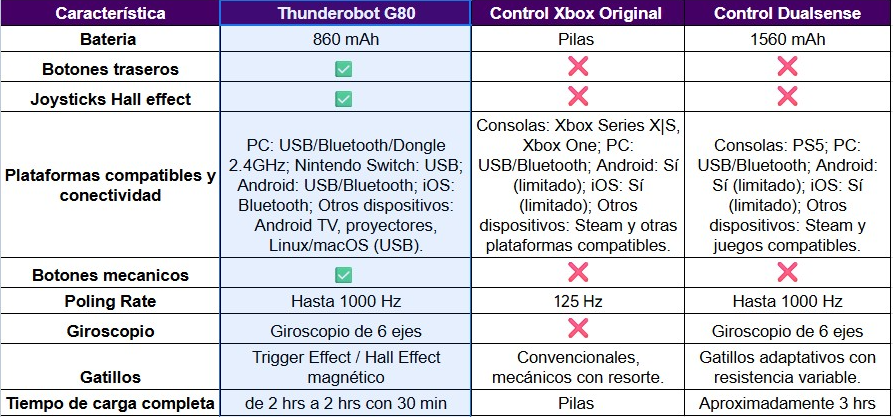 Podemos observar que el Thunderobot G80 destaca en varios aspectos por encima de los controles oficiales de otras marcas. De hecho, por sus características y prestaciones, podría incluso compararse con las versiones Pro de esas mismas, pero costando mucho menos.